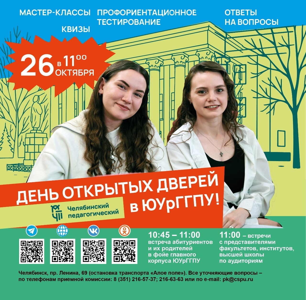 День открытых дверей пройдет в главном корпусе университета по адресу: г. Челябинск, пр. Ленина, 69 (остановка транспорта «Алое поле»). Все уточняющие вопросы можно задать по телефонам: 8 (351) 216-57-37; 216-56-31; 216-63-63 или написать на электронную почту Этот адрес электронной почты защищён от спам-ботов. У вас должен быть включен JavaScript для просмотра.