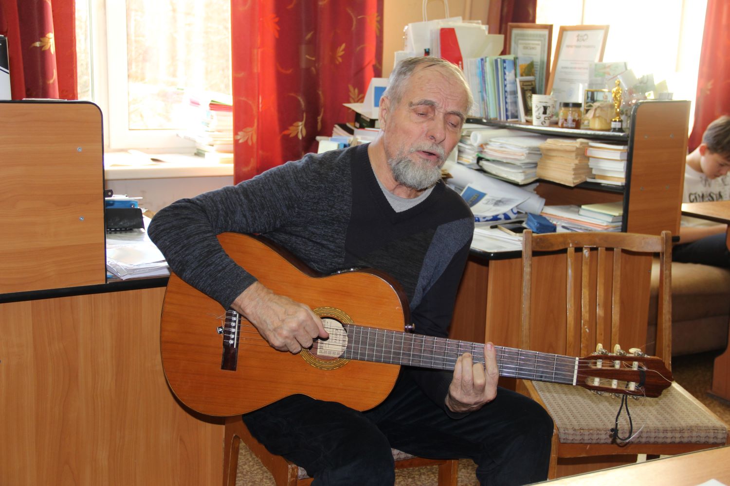После завершения диктанта, в узком кругу помощников международной акции, пили чай и слушали песни под гитару, за что отдельное спасибо барду Александру Солошенко.
