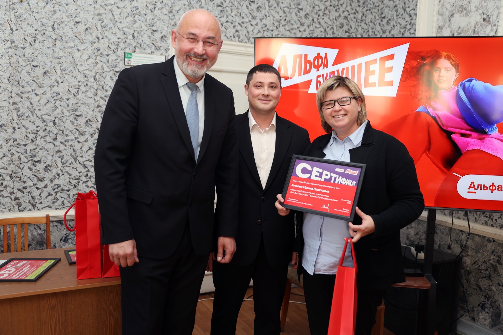Сертификат вручал региональный управляющий Альфа-Банка Сергей Снетков. Он отметил, что участие в программе приняли 2345 преподавателей. Было выбрано 300 лучших, которые стали обладателями грантов.