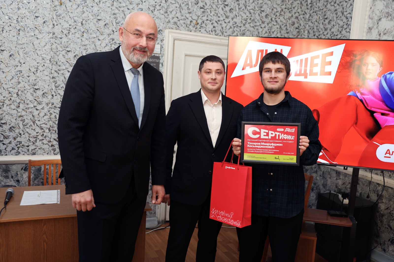 Кроме того, по программе «Альфа-Будущее. Стипендии» были отмечены студент факультета психологии и физической культуры Мааруфджон Тохиров и студентка факультета дошкольного, начального и коррекционного образования Виктория Ханенкова.